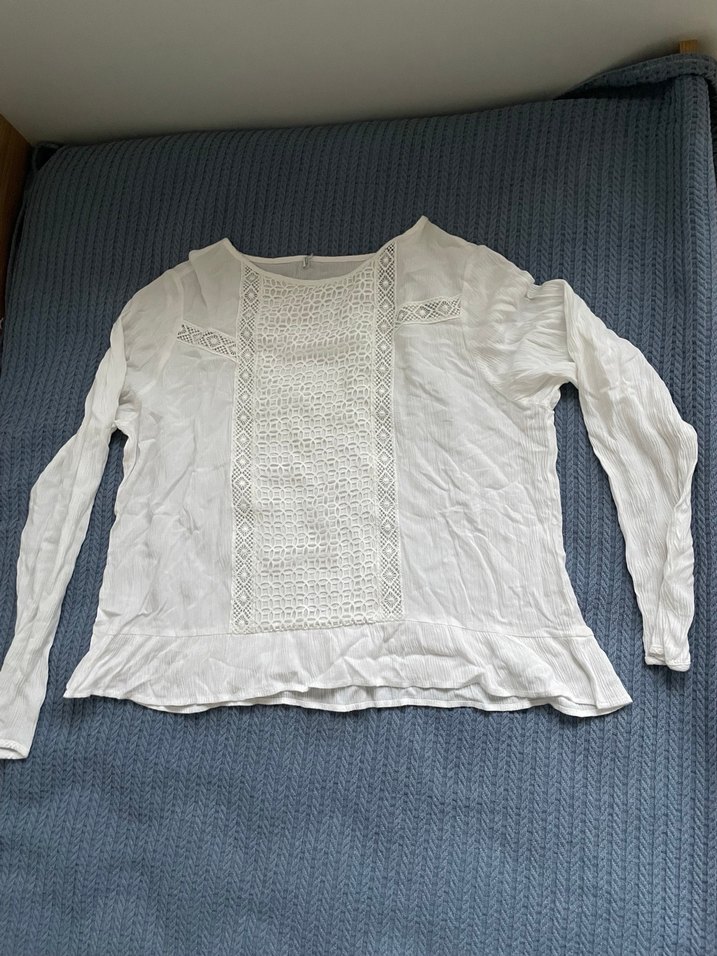 Ön kısmında dantel detayları bulunan beyaz keten bluz. Uzun kollu, yuvarlak yaka ve bol kesim bohem tarzdadır.