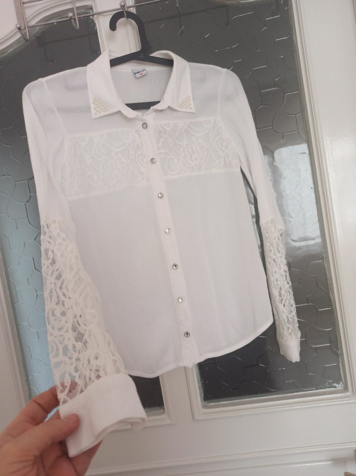 Dantel detaylı, beyaz uzun kollu kadın gömleği. Pamuklu kumaştan, yakalı ve bol kesimdir. Günlük sokak stiline uygundur. sıfır ayarında pafim marka bilen bilir
