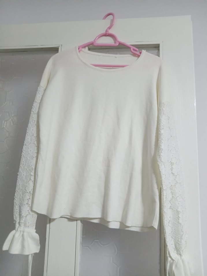 Beyaz triko kumaştan, dantel detaylı uzun kollu, yuvarlak yakalı ve normal midi boyda, rahat kesimli kazak. Günlük kullanıma uygundur.