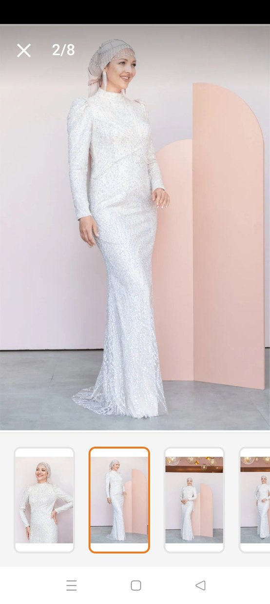Dantel kumaştan, uzun kollu ve V yaka kesime sahip, beyaz ve vücuda oturan bu nişan elbisesi klasik ve modern bir tarz sunar. 1-2 saat giyildi kuru temizLeme yapıldı