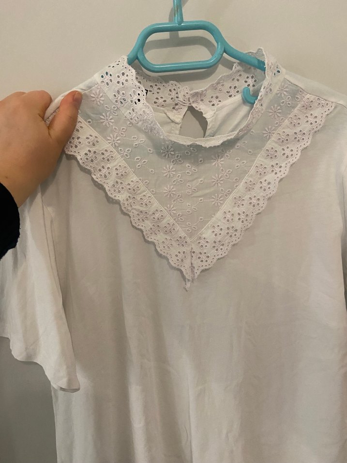 Dantel detaylı, V yaka beyaz bluz. Kısa kollu, nakışlı pastel desenli, bol kesim ve bohem tarzda.