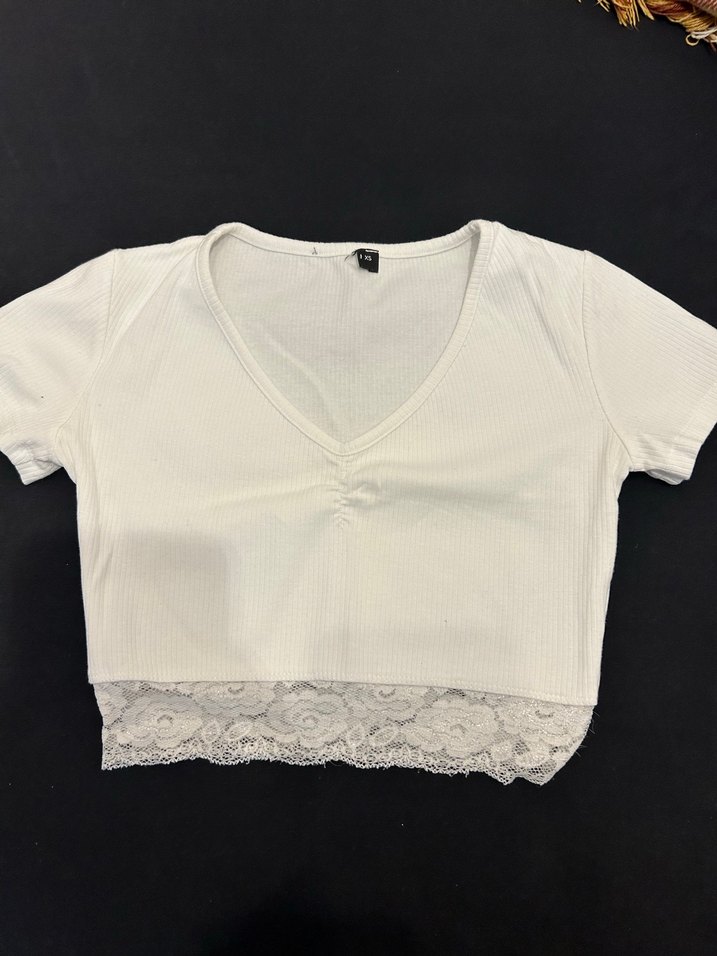 Pamuklu, kısa kollu ve V yaka beyaz crop top. Alt kısmında dantel detay bulunur, günlük rahat sokak stiline uygundur.