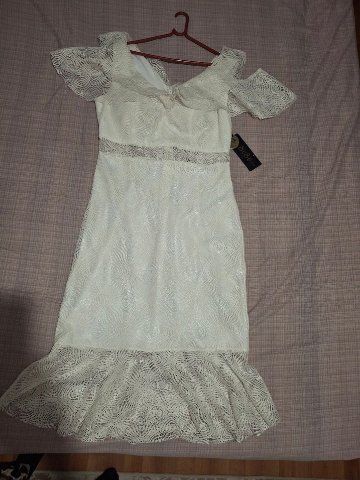 Dantel detaylı, V yakalı ve kısa kollu beyaz, uzun boylu, oturan kesim kadın abiye elbise. Vintage bohem tarzıyla zarif bir görünüm sunar.