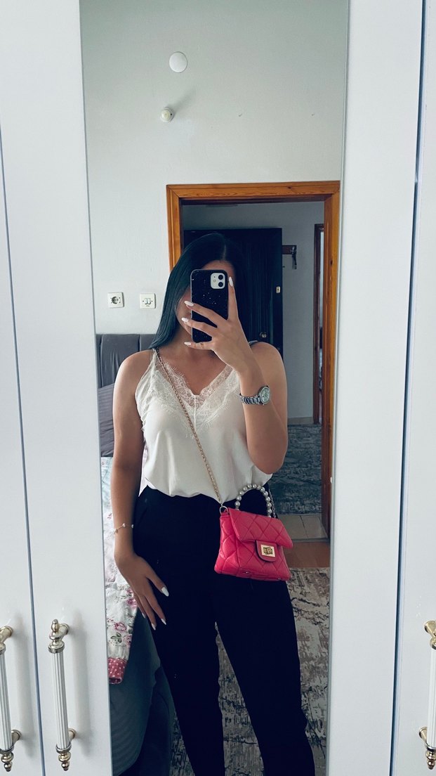 Dantel detaylı, V yaka beyaz kadın atlet. Yumuşak sentetik kumaştan, salaş kesim günlük kullanıma uygundur.