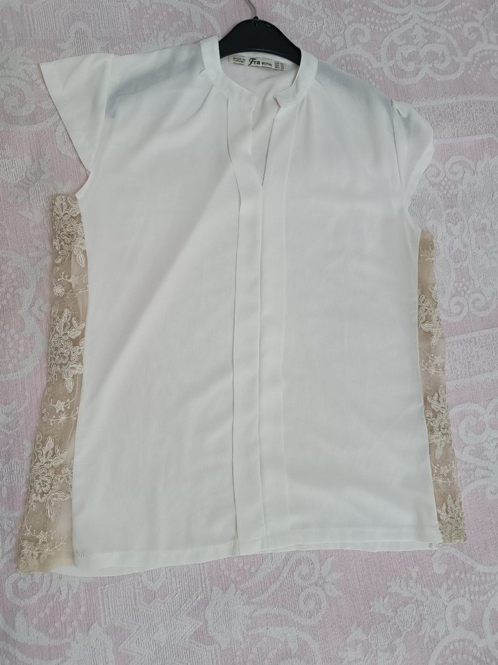 Kısa kollu, V yaka ve yanları dantel detaylı, rahat kesim beyaz kadın bluz. Yumuşak kumaştan, günlük kullanıma uygun.