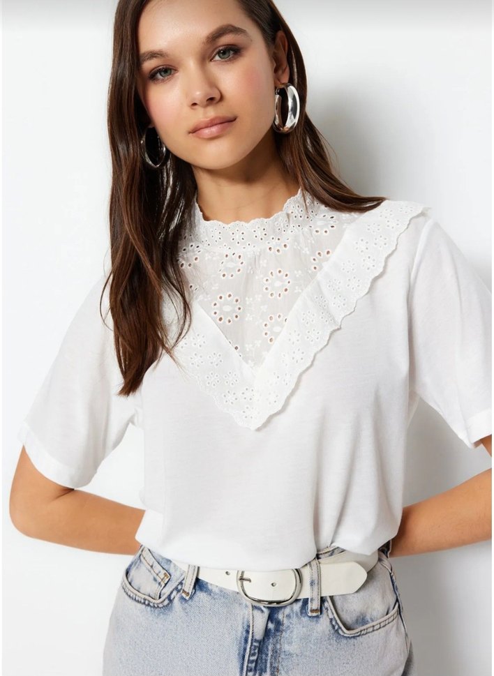 Pamuk kumaştan, dantel nakışlı V yaka, kısa kollu, bol kesim ve kısa boyda beyaz kadın tişörtü.