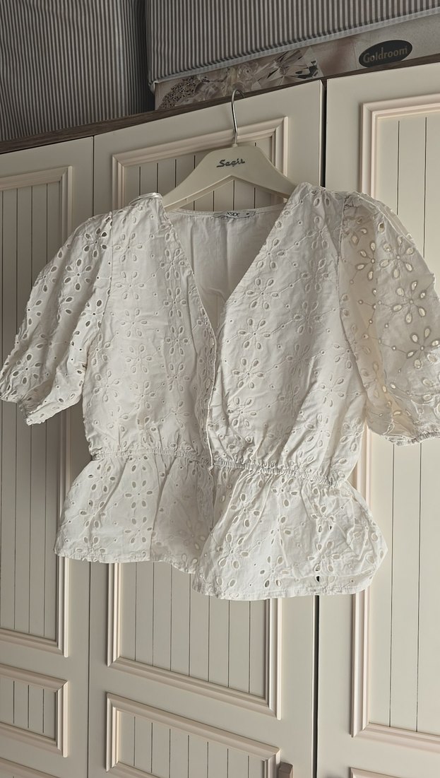 Yumuşak keten kumaştan, dantel nakışlı beyaz kısa bluz. V yaka, kısa kollu ve bol kesim, bohem tarzda mini boyda.