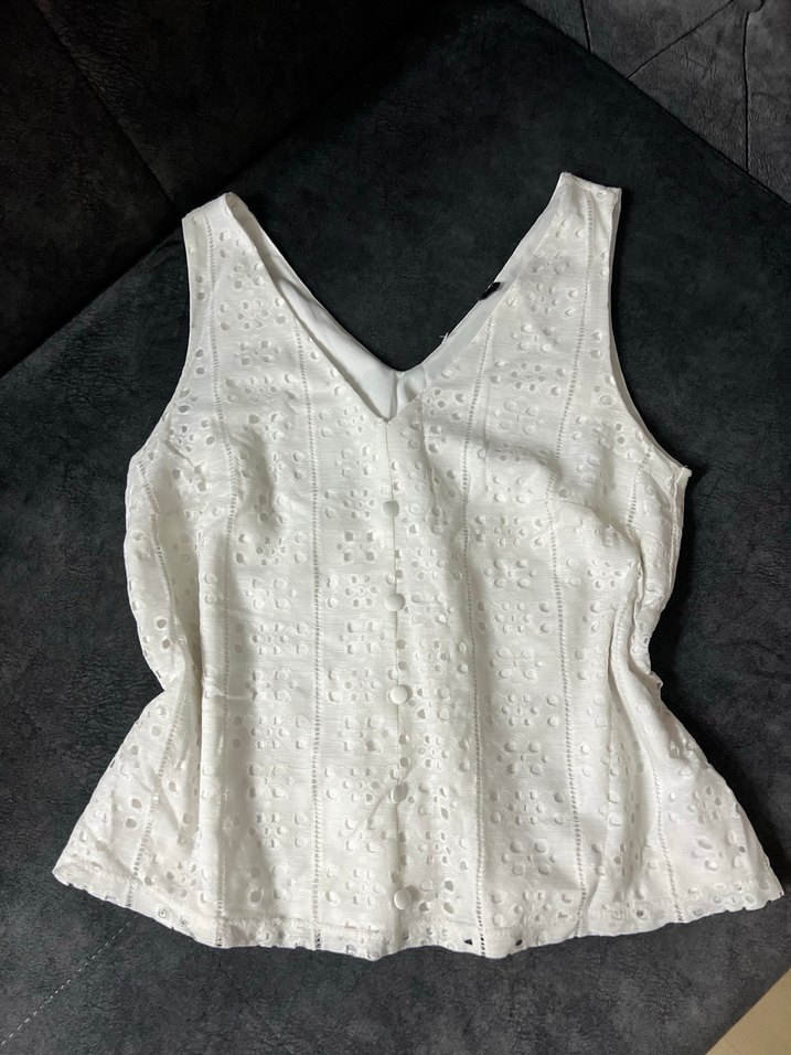 Yumuşak pamuktan, dantel işlemeli beyaz kolsuz bluz. V yaka, bol kesim ve midi boyda, minimalist bohem tarz için uygun.