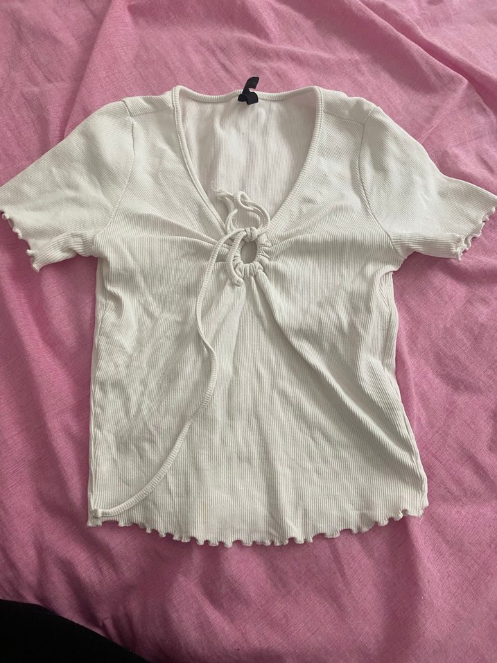 Beyaz renkli, kısa kollu ve V yaka dantel detaylı. Ön kısmı büzgülü ve yumuşak keten kumaştan, trend sokak stili için uygun.