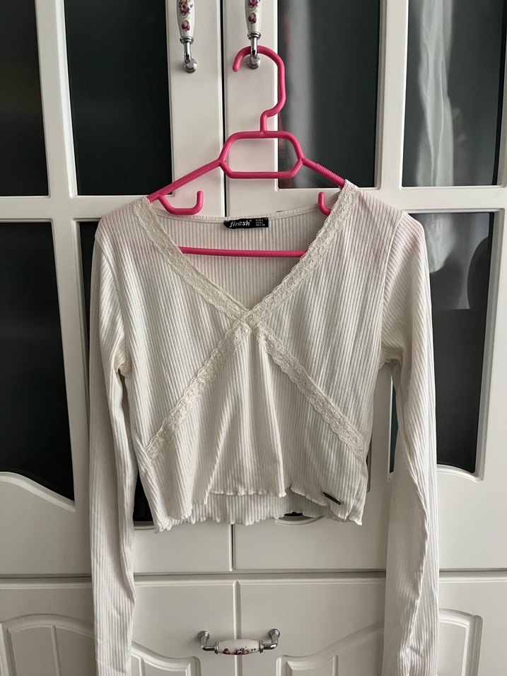 Dantel detaylı, uzun kollu beyaz bluz, pamuklu kumaştan, normal boyda ve v yaka, minimalist ve trend sokak tarzı için uygundur.