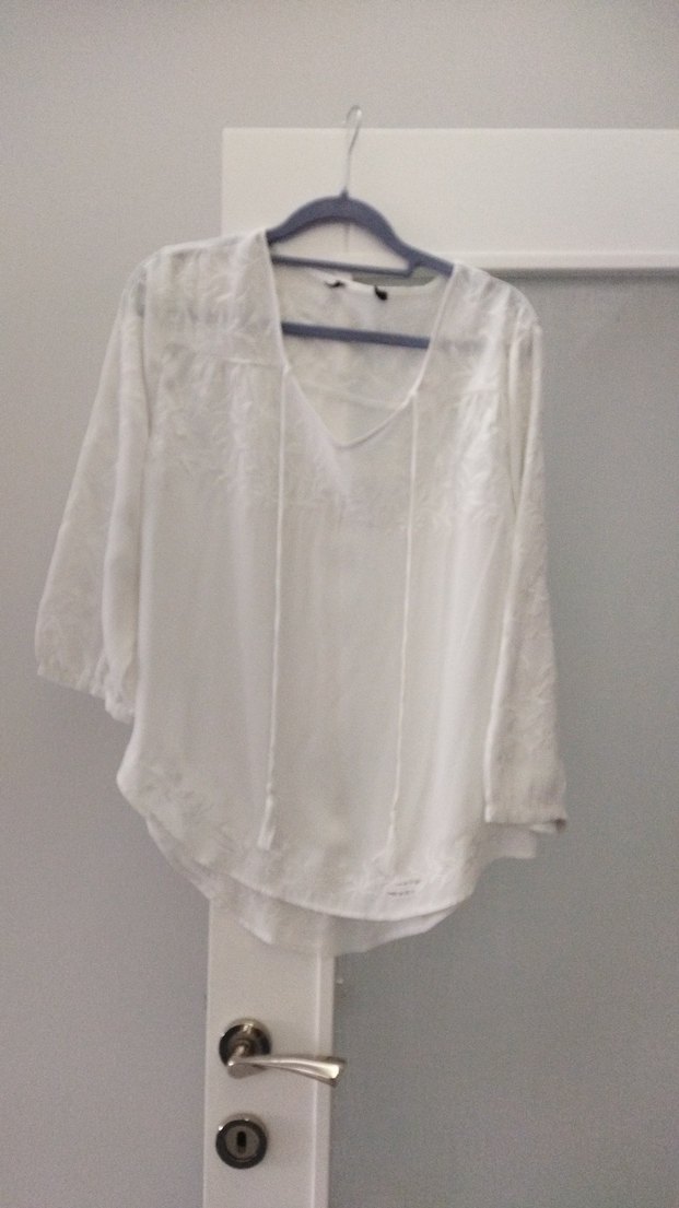 Dantel detaylı, V yakalı, uzun kollu beyaz bluz. Yumuşak keten kumaştan, bol kesim ve midi boyda, günlük kullanım için uygun bohem tarzda.