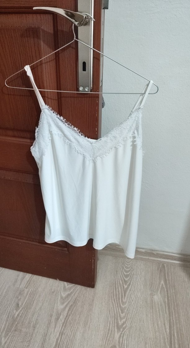 Pamuklu, dantel detaylı beyaz, V yakalı, kolsuz kadın atlet. Rahat kesimli ve midi boydadır, günlük kullanıma uygundur.