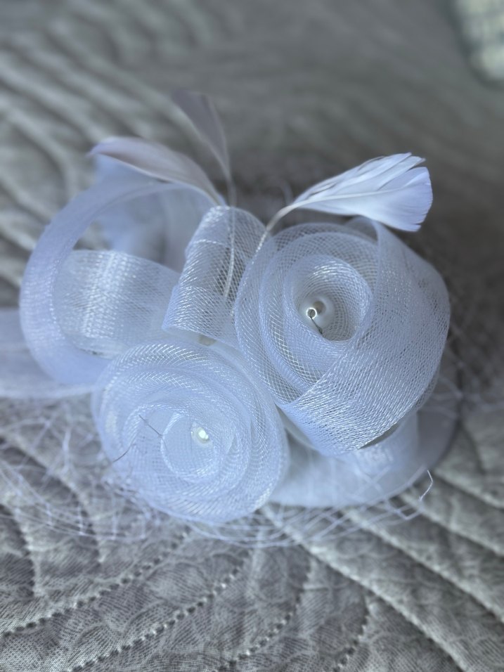 Dantel detaylı, beyaz renkte vintage tarzda bohem düğün aksesuarı. İnce kumaş çiçekler ve tüylerle süslenmiştir.