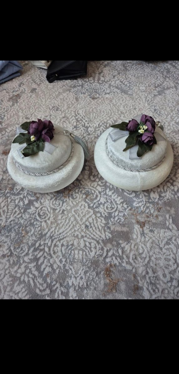 Dantel detaylı, mor çiçek süslemeli beyaz vintage düğün aksesuarları, klasik tarzda ve gri tonlarda.