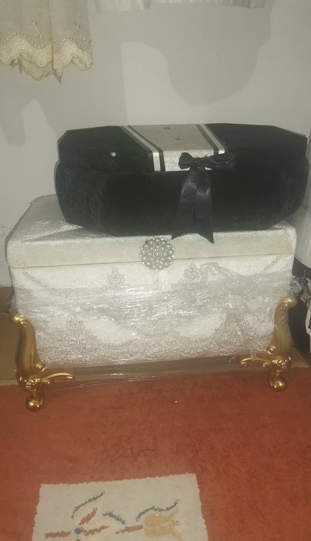 Dantel detayları ve parlak yüzeyiyle beyaz vintage düğün kutusu, klasik şıklık sunar. Zarif süslemelere sahiptir.
