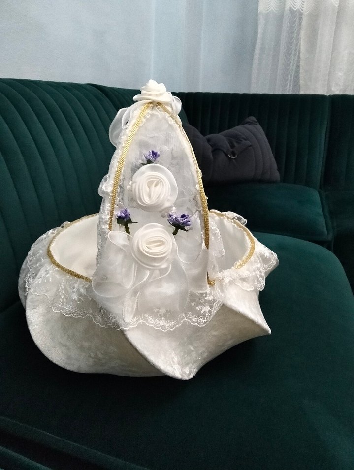 Dantel detaylı, beyaz renkli ve vintage esintili düğün sepeti, zarif çiçek süslemeleriyle klasik şıklığı yansıtıyor.