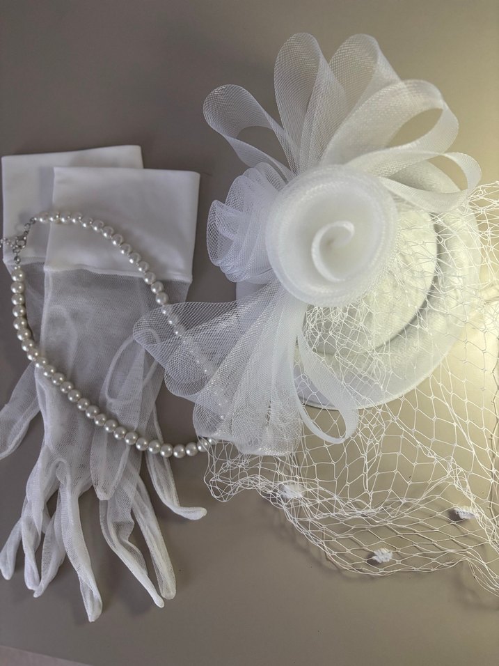 Dantel detaylı beyaz eldivenler, inci kolye ve tül süslemeli şapka içeren vintage gelin aksesuar seti. Klasik ve geleneksel bir şıklık sunar. Çekimde yarım saat kullandım