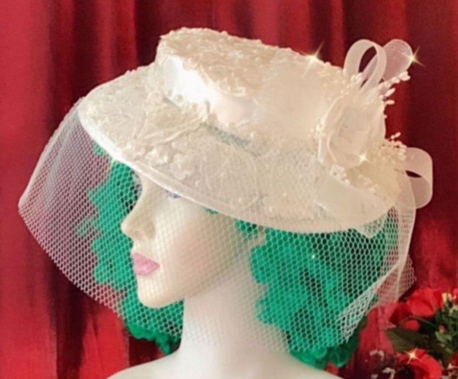 Dantel detaylı, hafif ve zarif tasarıma sahip beyaz vintage gelin şapkası.