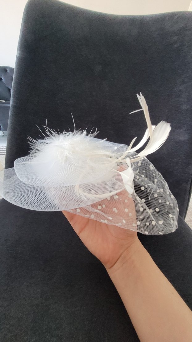 Dantel detaylı ve narin tüylerle süslenmiş beyaz vintage gelin şapkası, bohem ve modaya uygun tarz için ideal. hiç kullanılmadı tertemiz sorunsuz