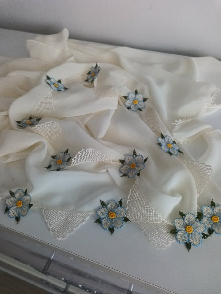 Dantel kenarları ve nakışlı çiçek detaylarıyla beyaz tekstil fular, vintage ve bohem tarzları yansıtıyor. Hafif ve zarif tasarım.