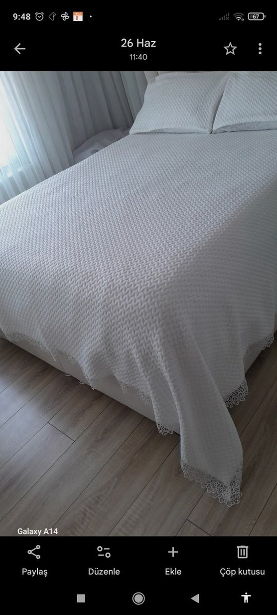 Yumuşak dokulu beyaz yatak örtüsü, dantel detayları ile şık ve sade bir görünüm sunar. ️