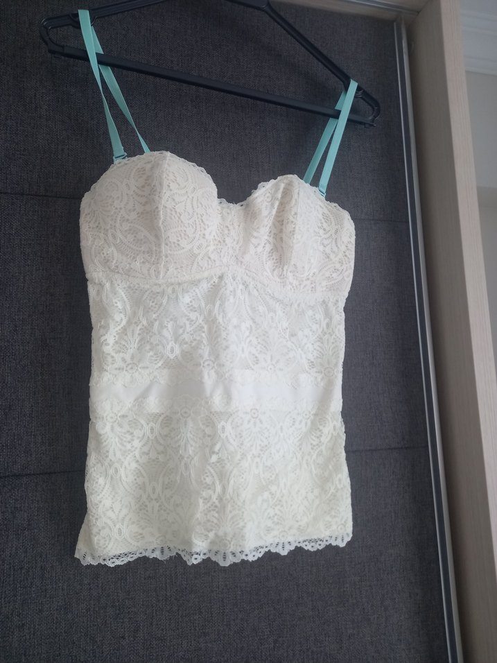 İnce askılı, dantel detaylı beyaz fitted bustiyer. Hafif sentetik kumaştan, vintage bohem tarzında, günlük kullanıma uygun. göğüs 36 cm bel 36 cm.ayarlanabilir askı. hiç giyilmedi