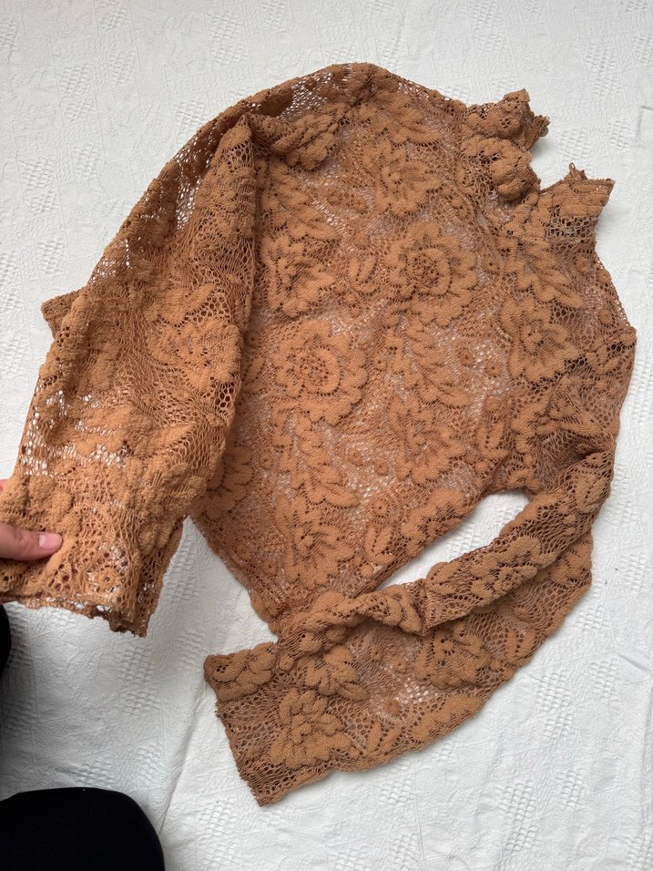 Bu dar kesim bej bluz, uzun kollu ve boğazlıdır, dantel detaylı örme kumaştan yapılmıştır. Vintage bohem tarzını yansıtır, günlük kullanıma uygundur.