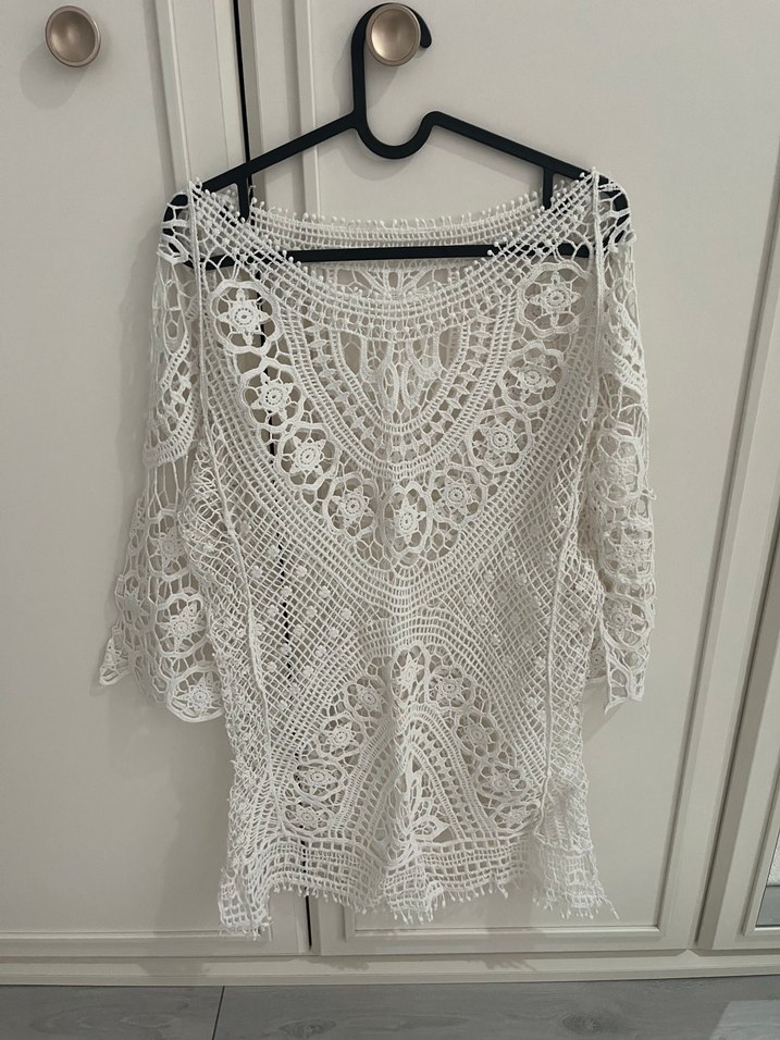V yaka, uzun kollu, bol kesim beyaz bluz, dantel ve nakış detaylarıyla bohem tarzı yansıtıyor.