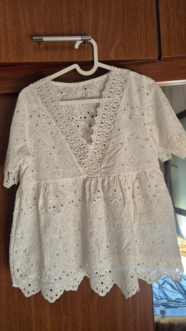 V yaka ve dantel detaylı, bol kesim beyaz pamuklu bluz. Kısa kollu, fisto, nakışlı desenlerle bohem tarzı için uygundur. Marka temsili