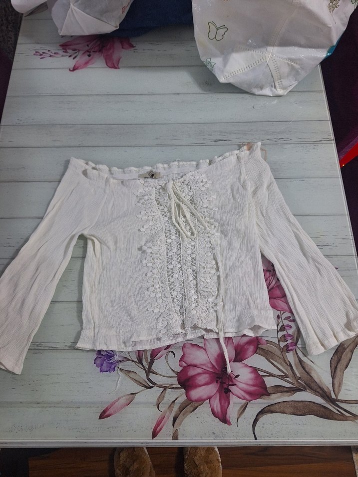 Pamuklu, uzun kollu, kayık yaka beyaz mini bluz. Dantel ve işlemeli detaylarla bohem tarzını yansıtır. Rahat kesimlidir. 35cm uzunluk M beden