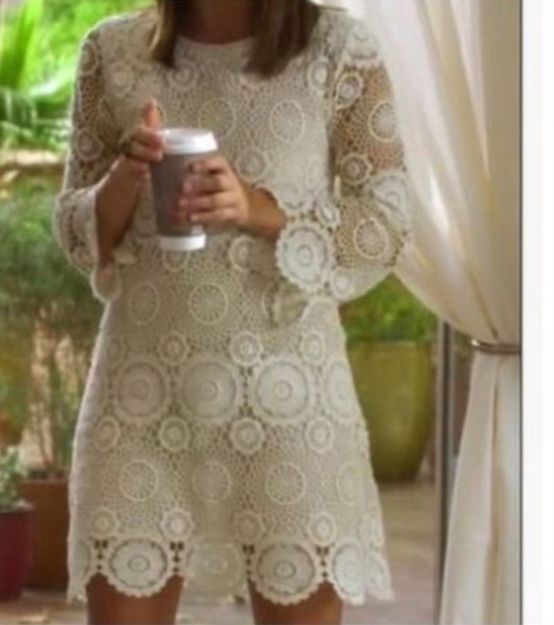 Bohem tarzda, dantel işlemeli beyaz triko elbise. Uzun kollu, yuvarlak yaka ve midi boyda, rahat kesimle tasarlanmıştır.