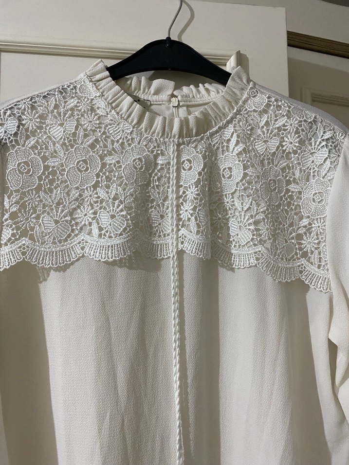 Dantel detaylı, yüksek yakalı beyaz tunik. Keten kumaştan, nakışlı ve bol kesim. Kısa kollu, günlük kullanıma uygun bohem tarzda.