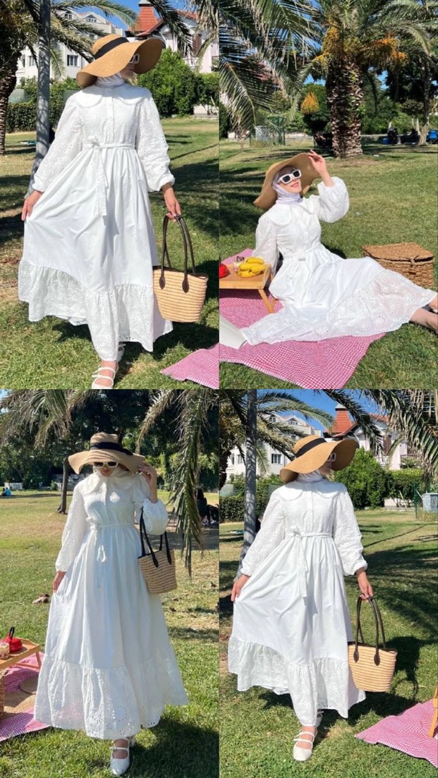 Dantel işlemeli, yüksek yakalı ve askılı kollu, bol kesim beyaz uzun elbise. Bohem tarzı için uygun. 38-40-42 beden uyumlu