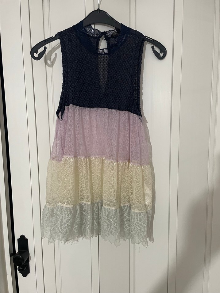 Dantel detaylı, kolsuz örme kumaştan yapılmış elbise. Bohem tarzda, pastel çok renkli, gevşek kesim ve halter yaka özelliklerine sahiptir.