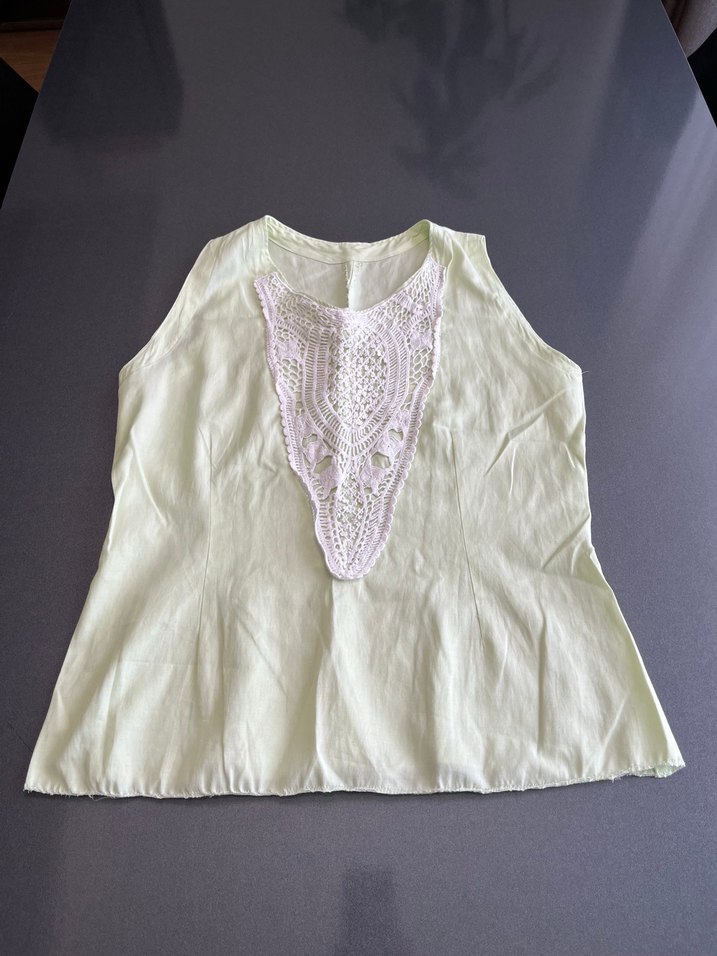 kumaştan yapılmış, dantel detaylı ve nakışlı desenli, V yaka, kolsuz, bol kesim bohem bluzu. Hafif pastel beyaz renktedir.