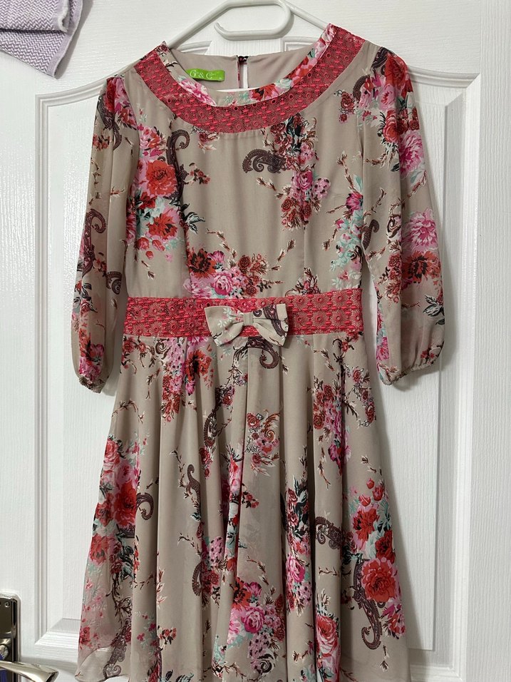Bej renkli, çiçek desenli ve dantel detaylı bol kesim midi elbise. Yuvarlak yaka ve askılı kollarıyla ofis için uygundur.