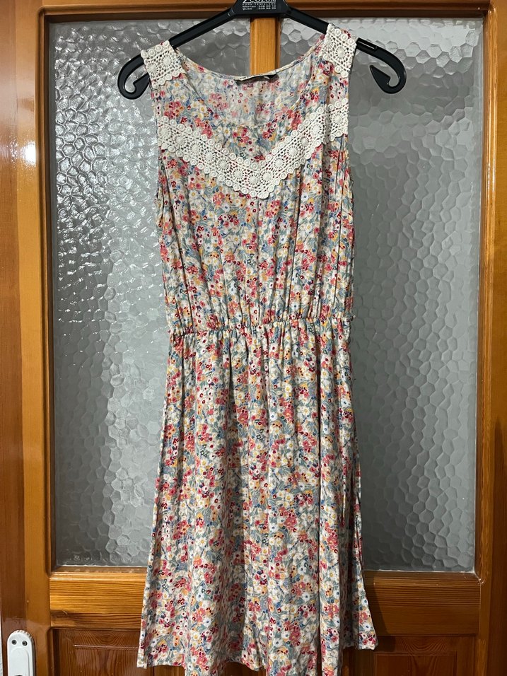 Dantel detaylı, V yaka, çiçek desenli, bol kesim, kolsuz midi boy bohem elbise. Çok renkli gri tonlarında tekstil kumaştan üretilmiştir.