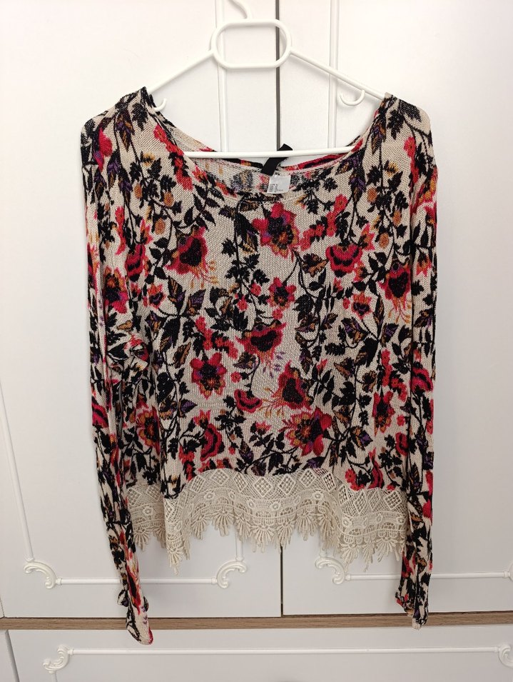 Bohem tarzda, uzun kollu, yuvarlak yaka, bol kesim bluz. Çok renkli çiçek desenli, yumuşak triko kumaş ve dantel detaylı etek ucu bulunur.