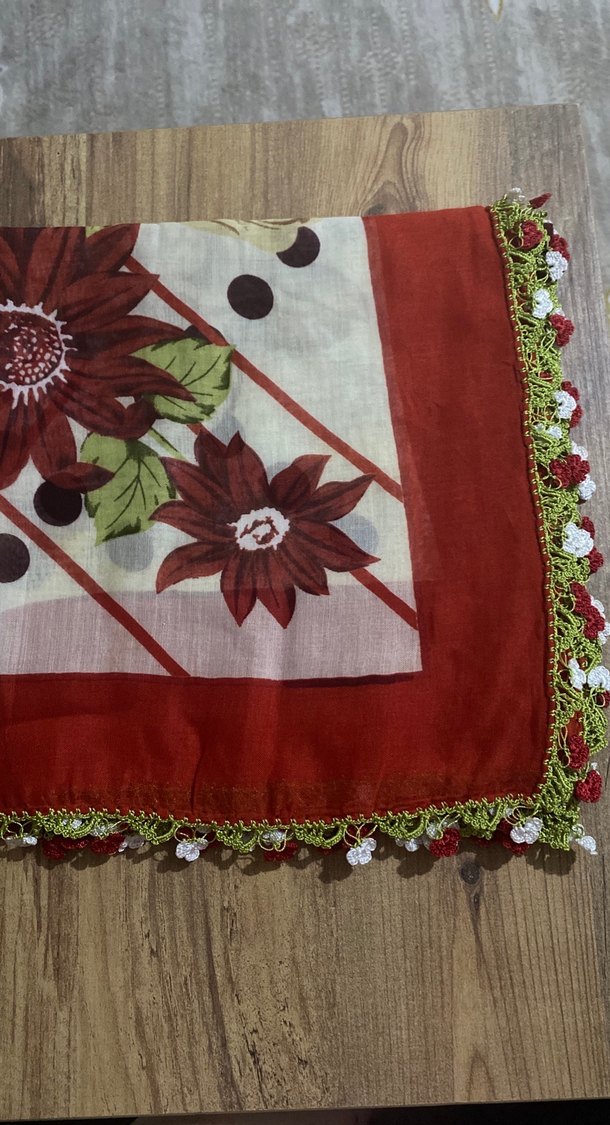 Koyu çok renkli çiçek desenli, dantelli bohem tarzı kadın şalı. Tekstil kumaştan üretilmiş, retro ve hippie bir hava katıyor.