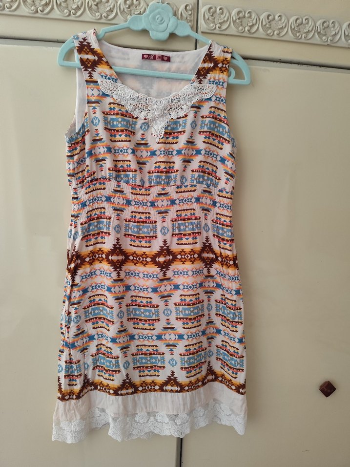 Dantel detaylı, kolsuz, pastel tonlarda çok renkli bohem midi elbise. V yaka ve bol kesimiyle rahat kullanım sağlar.