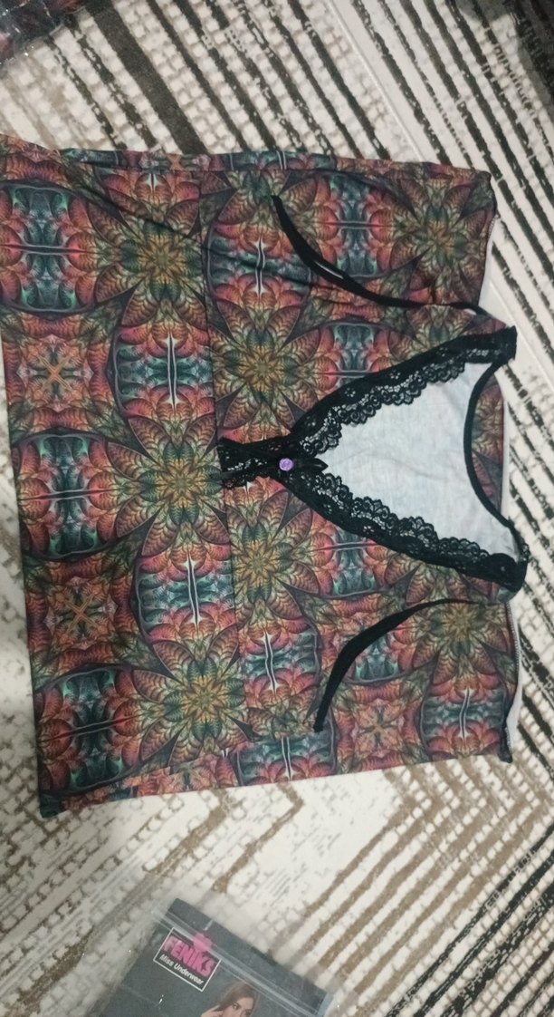 Renkli baskılı tekstil ve V yaka etrafında siyah dantel detaylı kolsuz bohem bluz. Salaş kesim ve mini boyda, günlük kullanım için uygun.