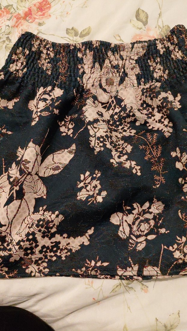 Dantel detaylı, bohem tarzda, koyu kahverengi desenli, bol kesim midi hamile eteği, romantik akşamlar için uygun.