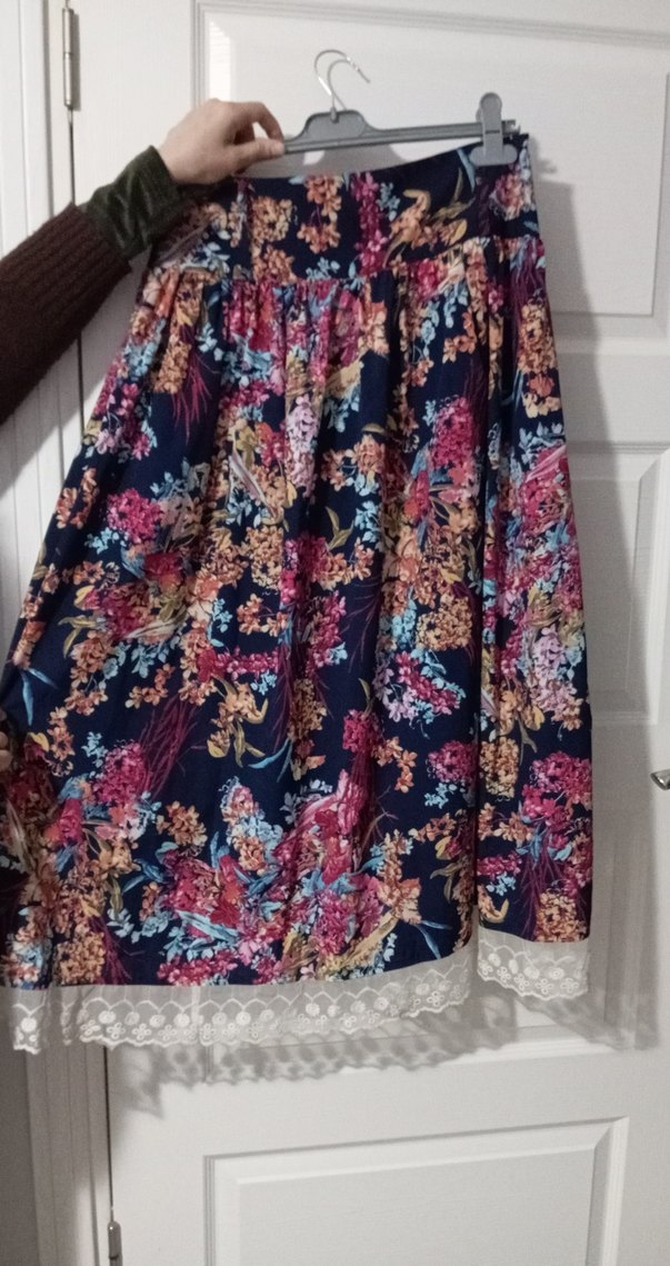 Dantel detaylı, çok renkli desenli uzun ve bol kesim etek yumuşak sentetik kumaştan üretilmiştir.