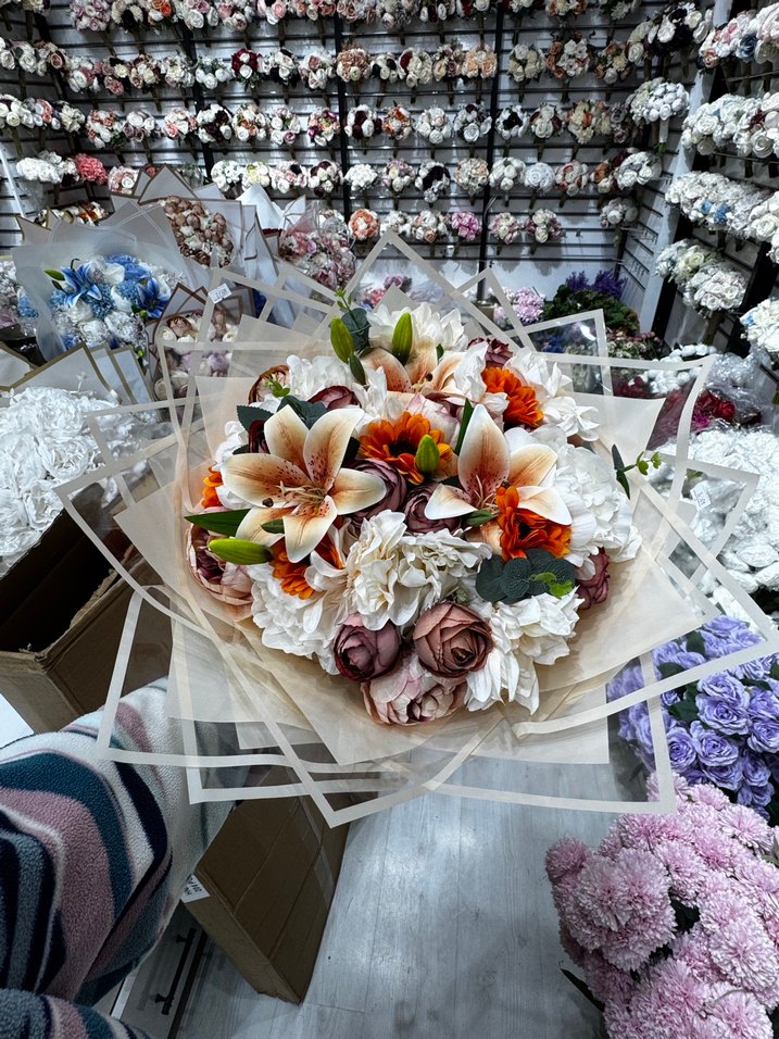 Dantel detaylı, beyaz tonlarda lilyum, gül ve çeşitli çiçeklerden oluşan bohem tarzda gelin buketi. Parisian retro havası taşır.