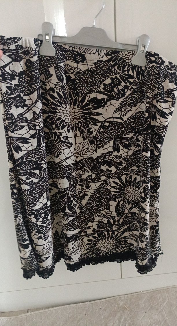 Uzun kesim, dantel detaylı, gri desenli tekstil kumaştan bohem tarzda, dar kesim hamile eteği.