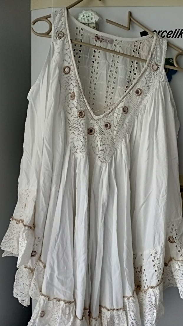 Dantel işlemeli, V yakalı, uzun ve bol kesim pamuklu bohem hamile bluzu.