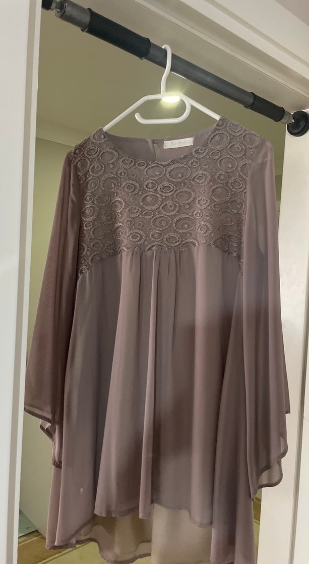 Toprak tonu , dantel işlemeli, uzun kollu ve yuvarlak yakalı, bol kesim, ipeksi dokulu bohem hamile bluzu. Romantik akşamlar için uygundur.