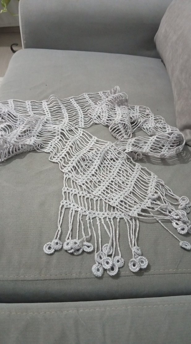seni gri ipten el örgüsü dantel detaylı bohem tarzda kadın atkısı. Retro ve hippie stiline uygun şık bir aksesuar.