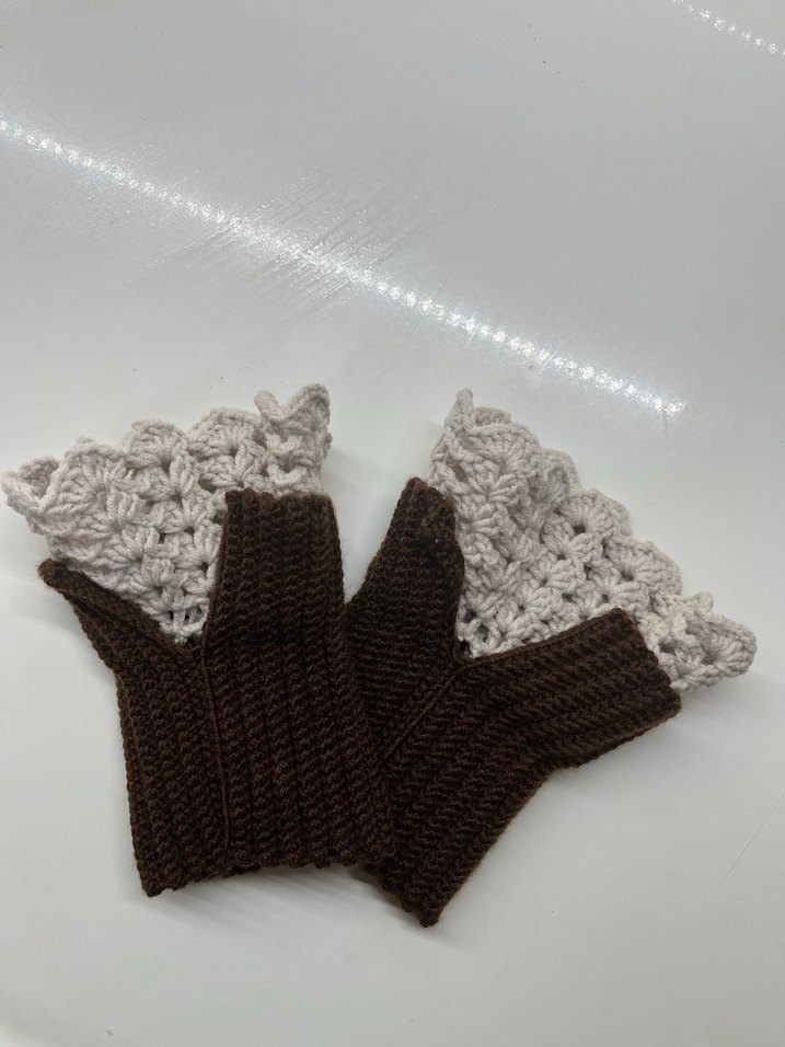 Kadınlar için kahverengi örme, gri dantel detaylı, bohem ve vintage tarzda rahat eldivenler. Sipariş üzerine istenilen renk modelde çalışılır.