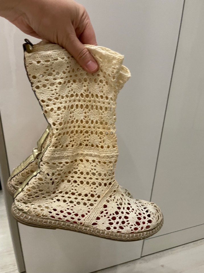 Dantel detaylı, nakışlı beyaz örgü espadril, kama topuklu. Bohem tarzı için uygundur.Dolapta beklediği için rengi biraz sarardı, bilginize!